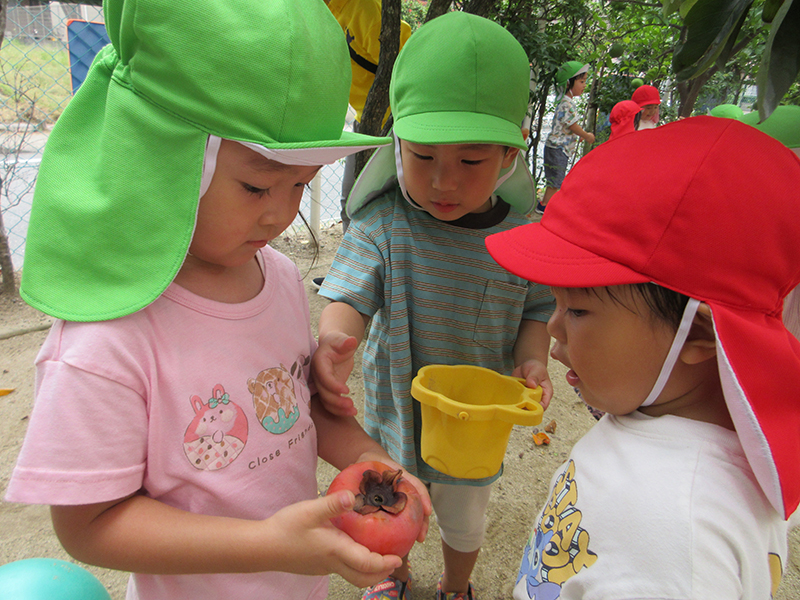 園庭の柿が大きく実りました。『大きいねぇ』『ぼくにも、ちょっと触らせて』